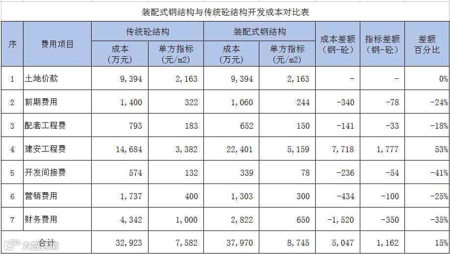 综合考虑,装配式钢结构较传统砼结构贵12%(但单独谈建安成本会贵53%);