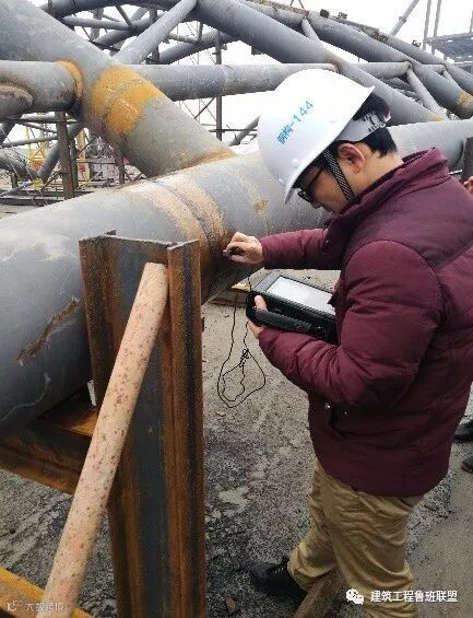 焊接完成24小时后,进行焊缝超声波探伤,检测焊缝内部质量。并采用焊缝量规检测相贯线焊缝趾部、根部的焊脚尺寸。正式吊装前,各个分块网壳的焊缝质量均检验合格。