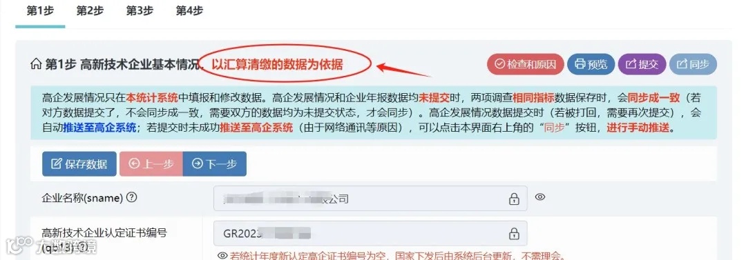 如填写数据不符合要求,点击“检查和原因”根据系统提示进行数据修正或说明。依次填报完第1至第4步(注意“以汇算清缴的数据为依据”,数据可暂存)。