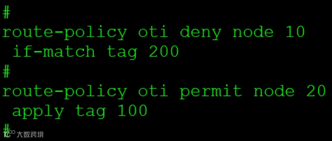 在R3上设置路由策略,将ISIS的路由引入到OSPF时,拒绝携带tag 100的路由引入,并将本身所属ISIS区域的路由引入到OSPF时打上tag 200的标签,路由策略如下图所示: