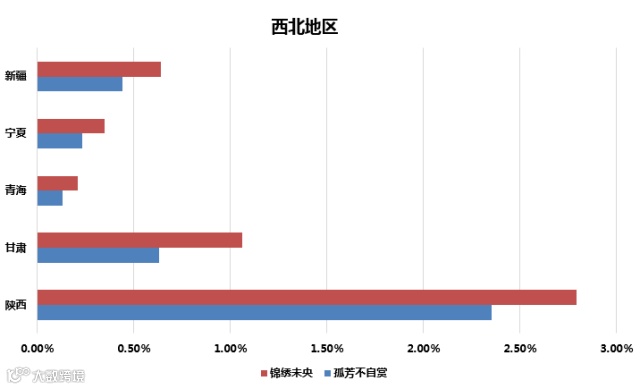 在西南和西北两大区域内,虽然两部作品的差距也并不大,但除四川省外,《锦绣未央》的覆盖率都要略高于《孤芳不自赏》。