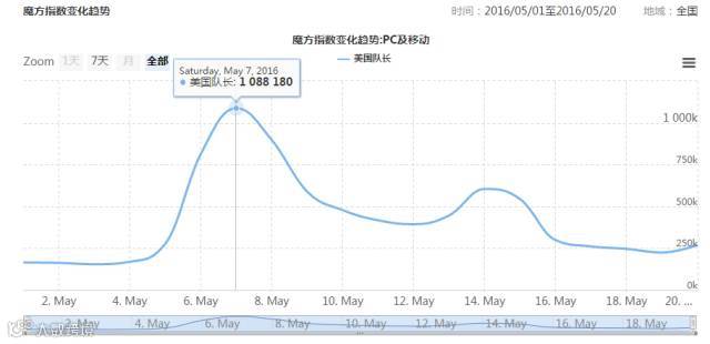 由上图得知,在电影上映的前几天,《奇异博士》的魔方指数最高为45.4万,而孵化成熟的《美国队长》则达到了108.9万。