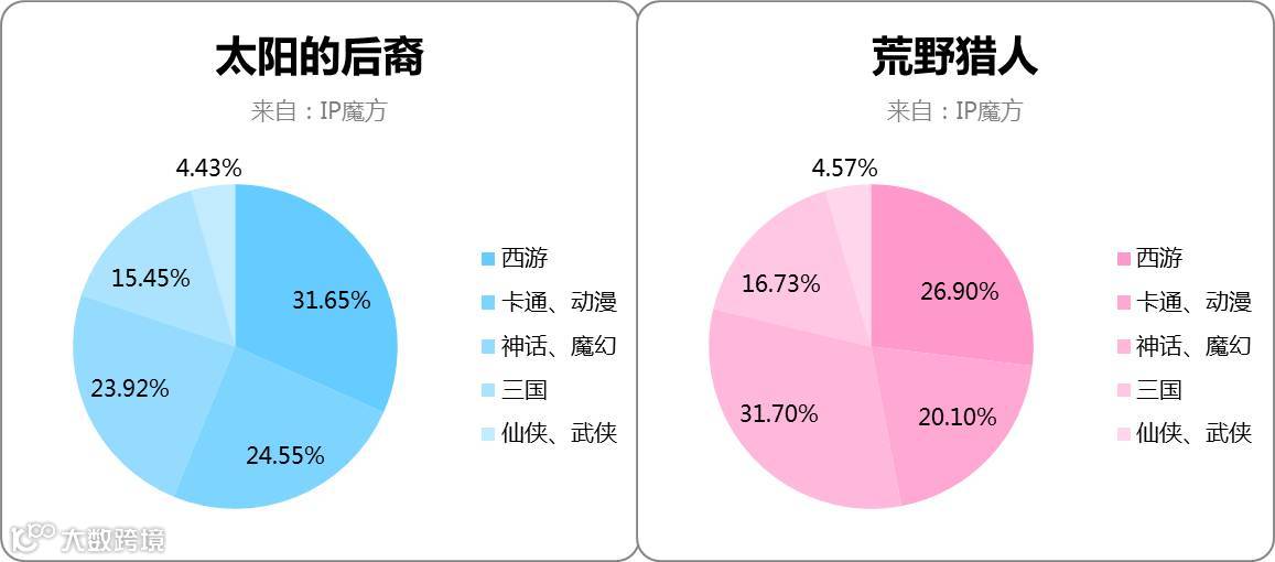 除了游戏类型,IP魔方还能告诉你《荒野猎人》的观众现在玩儿的更多是“神话、魔幻”题材的游戏,其次是“西游”题材。而对于《太阳的后裔》,“西游”题材则排在首位,其次是“卡通、动漫”。