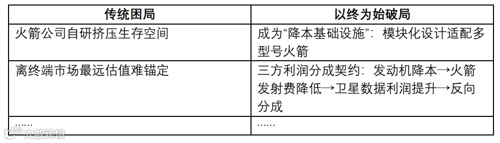 “终”是可量化的商业回报,而火箭公司的“终”和发动机公司的“终”有本质区别,发动机公司的“终”(降本利润)本质是火箭公司“终”(发射利润)的子集,二者通过降本分成协议实现利益捆绑,发动机公司只需要证明降本能力,而火箭公司要证明整个商业闭环的可行性。