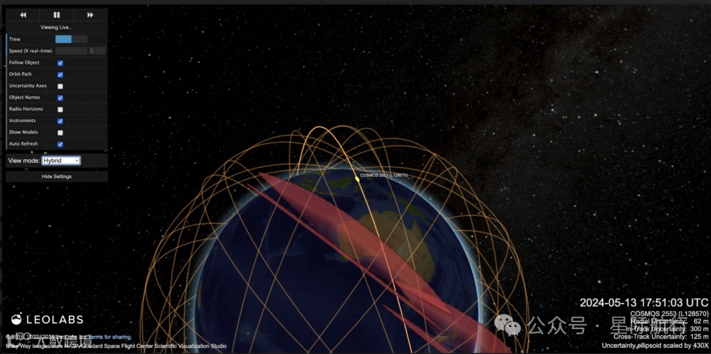 LeoLabs 对 Cosmos-2553 的雷达跟踪可视化。