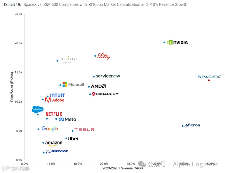 如果把SpaceX和S&P 500的巨头放在一起,它仍然处于“力速双A”的第一象限。