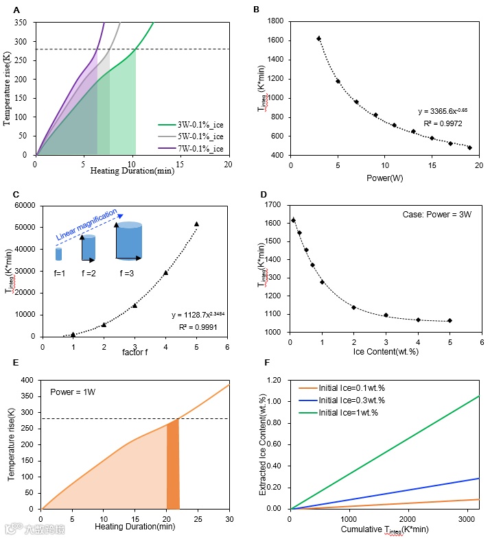 进一步的,他们发现加热炉采集的温度数据,尤其是中心点的升温曲线,可以直接反演月壤的水冰含量。原因在于,含水冰月壤由月壤颗粒和水冰颗粒混合组成,其升温曲线受控于混合组分的热导率,而热导率又受控于水冰含量,因此通过对不同升温曲线的分析可以反演水冰含量(图3A-图3D),并且极限载荷功率下,例如1W,仍然能够实现分析需求(图3E、图3F)。这种方法相比于后续测量环节中质谱和光谱分析无需考虑样品称重、样品转移过程中的吸附、损耗及泄漏等因素,是一种新的测量月壤水冰含量的方法。