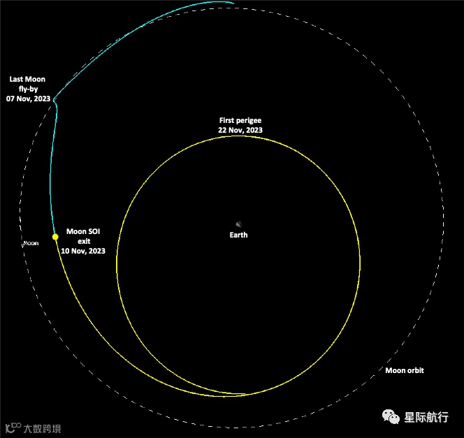 地球进入(TEI)机动于2023年10月13日进行。报告补充说,在TEI机动后实现的轨道上,推进舱在11月10日离开月球SOI之前进行了四次飞越月球。