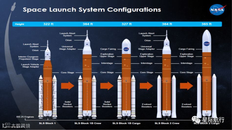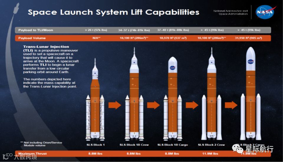 1 SLS系列火箭:主要包括SLS Block1(TLI地月转移入口点运载能力大于26t)、SLS Block1B Crew载人型(TLI地月转移入口点运载能力大于34-37t)、SLS Block1B Cargo货运型(TLI地月转移入口点运载能力大于37-40t)、SLS Block2 Crew载人型(TLI地月转移入口点运载能力大于45t)、SLS Block2 Cargo货运型(TLI地月转移入口点运载能力大于45t,即使考虑整流罩外形变化对气动的影响,货运型理论上应该比载人型的运载能力要提高不少,这个数据保守了?)