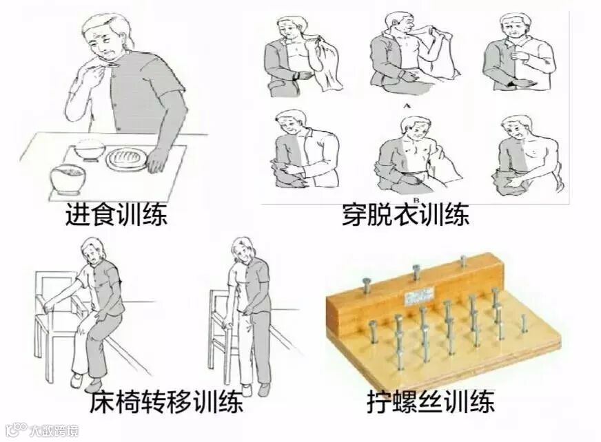 日常生活活动训练早期即可开展,如训练进食、个人卫生等,以后逐步进行穿衣、床椅转移、洗澡等有关日常生活活动的训练。还可以通过编织、绘画陶瓷工艺、橡皮泥塑等训练两手协同操作,通过打字、砌积木、拧螺丝、拾小钢珠等训练手的精细动作,也可以进行与家务劳动有关的作业训练,以提高患者的综合能力。