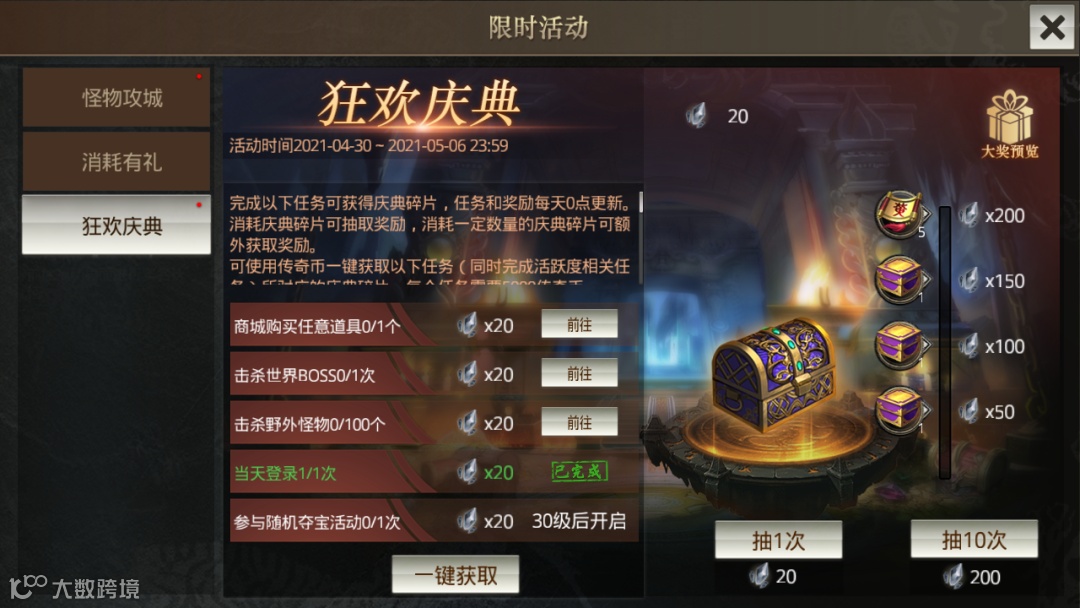 通过每天完成指定的任务以及次数即可领取节日庆典积分,通过积分可换取庆典大礼包,同时在完成任务的过程中也会额外获得奖励。