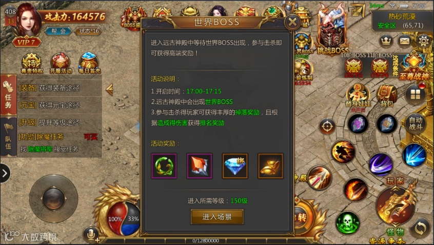 活动开启后BOSS出现,击杀后掉落玉佩、神石精华、元宝和大量绑钻。击杀后还会根据伤害排行发送额外奖励。