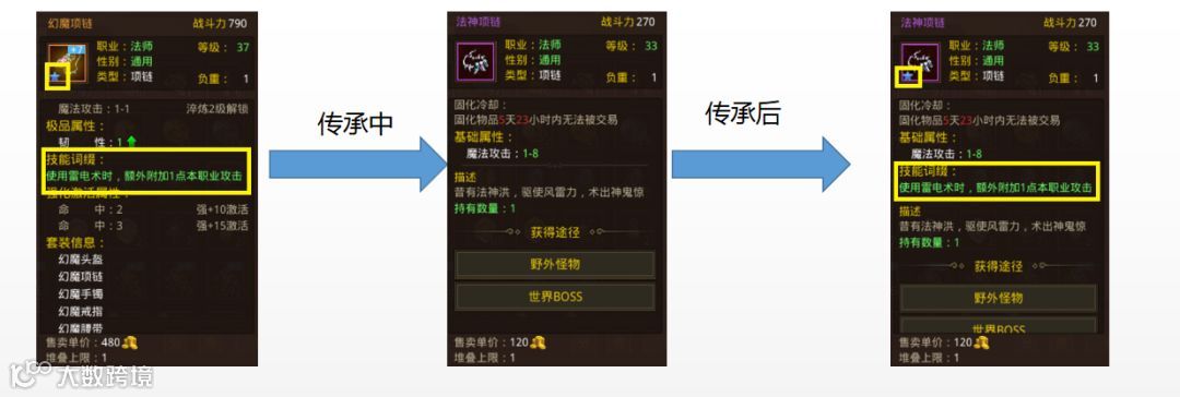 ⑥传承规则:武器和项链可以相互传承,衣服和腰带可以相互传承,头盔和靴子可以相互传承,戒指只能传承戒指,手镯只能传承手镯。