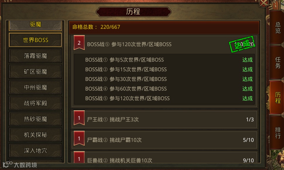挑战世界/区域boss、精英怪以及野怪的次数并获取的成就点。