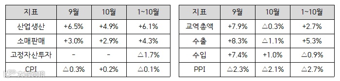 - (물가) 국경절 연휴 효과로 소비자물가지수(CPI 10월 +0.2%)가 3개월 만에 상승세로 전환했고, 생산자물가지수(PPI 10월 △2.1%)가 3개월째 개선세를 유지