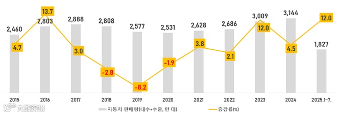 - 1~7월 누적 판매량은 전년 동기 대비 12% 증가한 1,826만 9천 대로 나타남