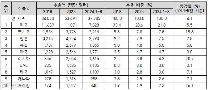 - 해관총서에 따르면 2024.1~8월 중국 자동차 수출액은 전년 동기 대비 7.9% 증가한 4,384억 위안을 기록