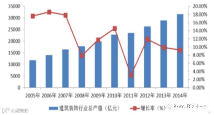 - 2005~2014년간 외장·외벽 인테리어 시장 역시 크게 성장했음. 중국 인테리어협회의 통계에 따르면, 2005년 총 산업액은 400억 위안이었으나 2014년에는 3000억 위안에 이르러 25.09% 상승했음.