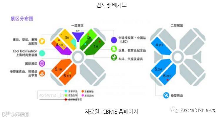 - 活色生鲜은 유아용 식품의 신선도와 건강식, 乐活美妈는 애기엄마가 사용하는 제품, 乐教体验은 유아용 수영장 및촬영 등 乐享户外는 어린이 자전거, 킥보드 등 야외활동용품을 지칭하며, 크게 위 4가지 테마로 중심으로 전시회가 구성됨.