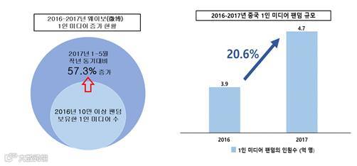 - iResearch의 '중국 1인 미디어 발전 동향 보고서'에 따르면 2017년 1~5월 10만 명 이상의 팬덤을 보유한 1인 미디어 수가 전년동기대비 57.3% 증가함. 동시에 1인 미디어 팬덤의 규모도 지속 확대됨. 2017년 5월에 이미 4억7000만 명에 도달해 2016년 대비 20.6% 증가함. 이런 추세에 따라 앞으로도 중국의 1인 미디어 시장과 팬덤의 지속적인 성장이 예상됨.