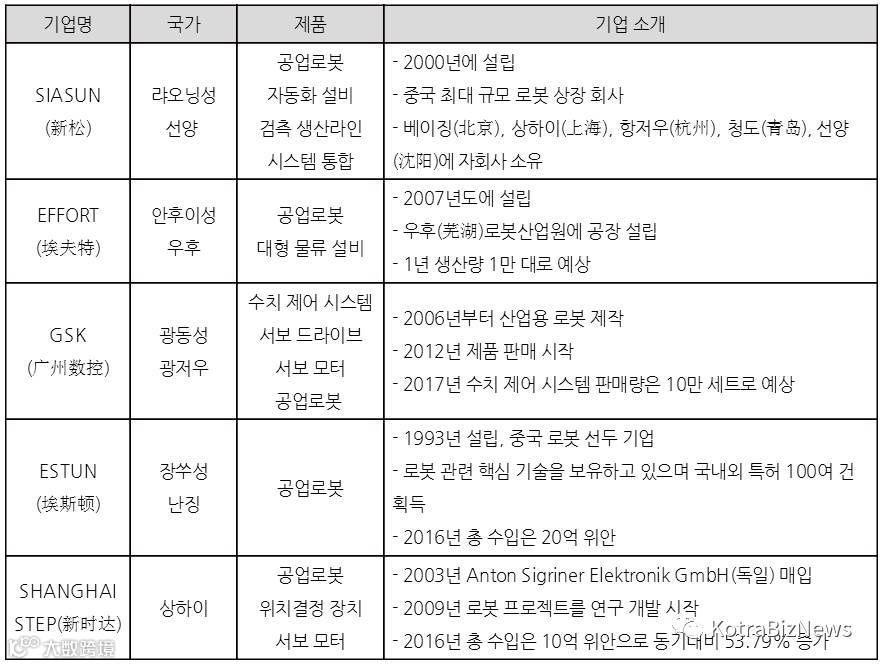 자료원: 기업별 홈페이지 활용 KOTRA 난징 무역관 정리
