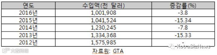 - 물론 대한 수입 규모는 줄고 있지만 2016년 한국은 점유율 32.78%로 계속 1위를 지킴.
