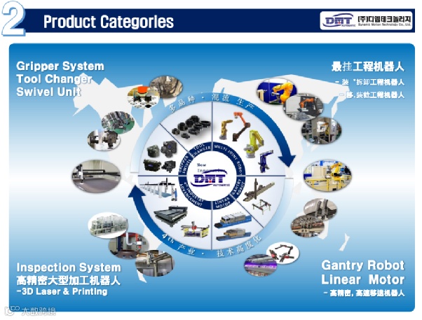 为满足客户所要求的高速度、高精密、高负载的要求,DMT公司所研制的新型滑动方式桁架机器人系统和旋转夹持机器人系统,获得了多项特许专利,实现桁架机器人和旋转及气爪欧洲产品国产化、标准化。机器人专用直线电机研发并商用化。作为物流自动化的专门企业, 全体员工力争对客户的感谢转变成以最优的品质来报答而不懈努力。