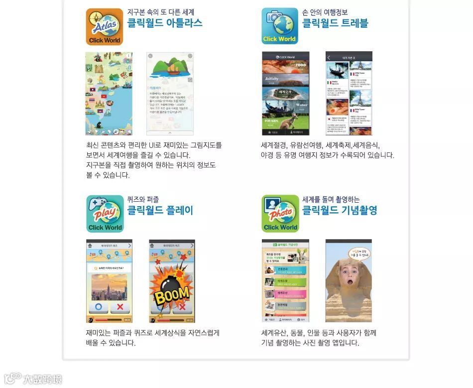 使用专利地图识别系统的专用应用程序点击世界在PLAY Store或APP Store免费下载.瑞全智能地球仪里面拍摄了UNESCO遗产,世界动植物讲解,教育信息,测试,迷你游戏,世界节日介绍,旅行信息等多样性的数字化内容,引导正确的学习。