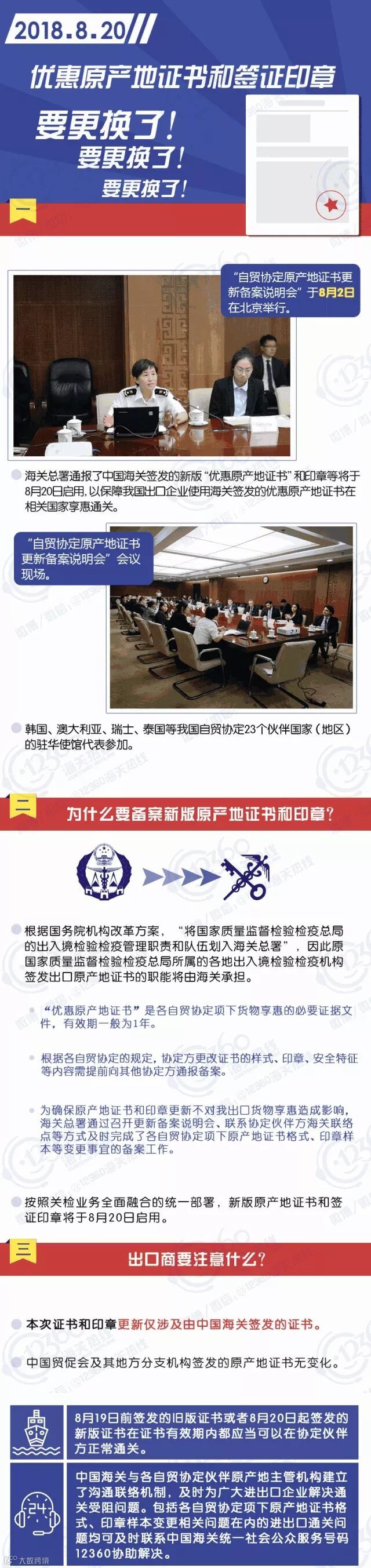 “自贸协定原产地证书更新备案说明会”于8月2日在北京举行。海关总署通报了中国海关签发的新版“优惠原产地证书”和印章等将于8月20日启用,以保障我国出口企业使用海关签发的优惠原产地证书在相关国家享惠通关。