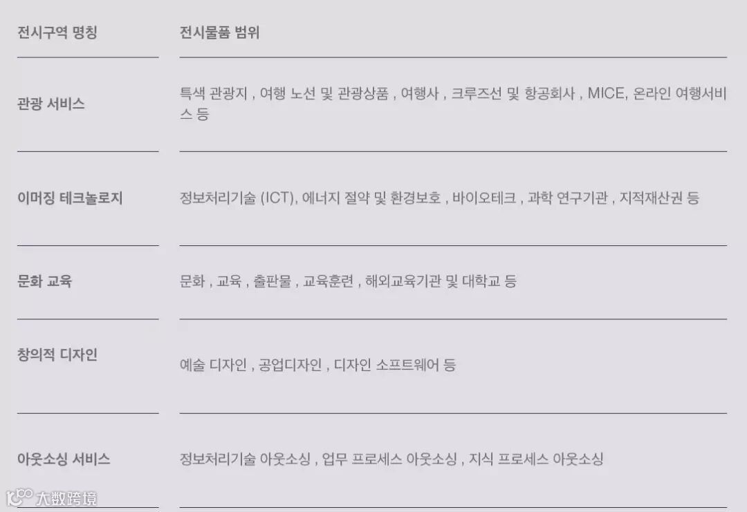 상품무역 전시장과 서비스무역 전시장 2 곳으로 나뉩니다 .상품무역 전시장은 스마트 및 첨단 장비 , 소비용 전자 및 가전 제품 , 의류 및 생활용품 , 자동차 , 식품 및 농산물 , 의료기계 및 의약품 , 건강제품 등 6 개 전시구역으로 이루어져 있고 , 총 면적은 약 18 만㎡입니다 .서비스무역 전시장은 이머징 테크놀로지 , 아웃소싱 서비스 , 창의적 아이디어 및 디자인 , 문화교육 , 관광서비스 등의전시구역으로 이루어져 있고 , 총 면적은 약 3 만㎡입니다 .