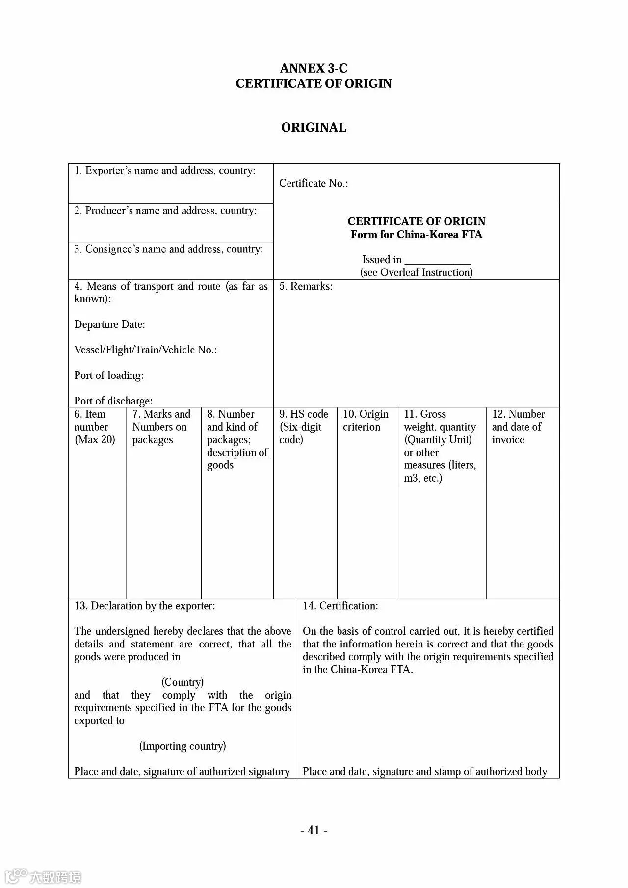 下面为中韩原产地证书范例