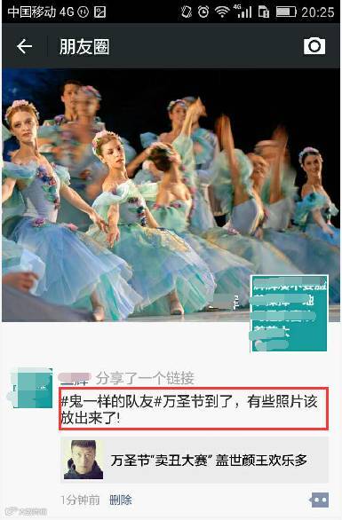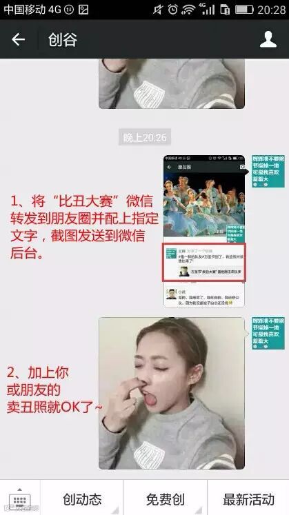 将“卖丑大赛”的微信分享到朋友圈,复制“#鬼一样的队友#万圣节到了,有些照片该放出来了!”文字,并将朋友圈截图和卖丑照发送到创谷微信后台,如下↓↓↓