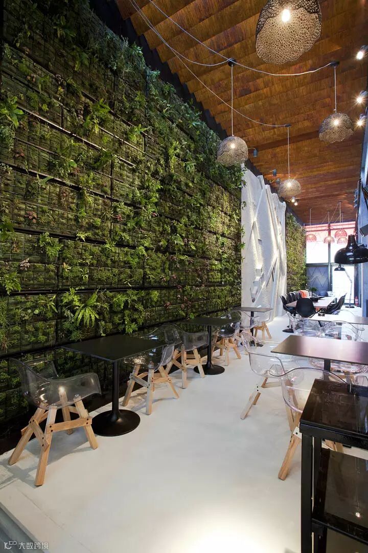 该咖啡厅位于雅典,拥有300平方米的区域。设计概念是想创造一个生态氛围的环境,以花园作为主题印象,绿色的墙壁安装两个半开放的空间。这些空间让阳光从屋顶直射进来形成了一个自然的色调。