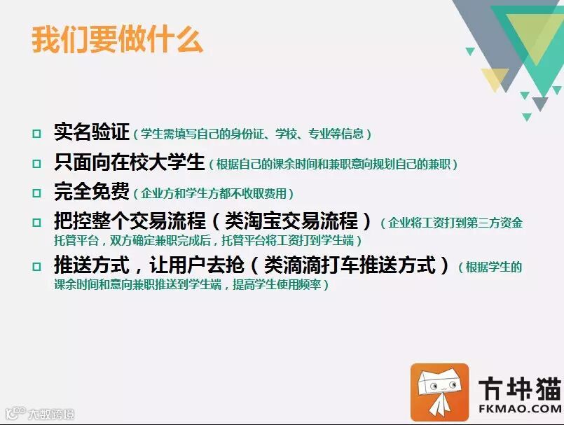 一个典型的案例:当互联网公司急缺地推人员,而养活一个地推团队是需要很大的成本,高难度兼职一般外包公司无法胜任。而学生一个月有8-10天空闲时间,大部分学生只有2天是找到适合自己并且工资满意的兼职,那么方块猫则可以根据学生在方块猫的行为数据,学生将自己的时间共享出来,从而达到学生和企业双赢的效果。
