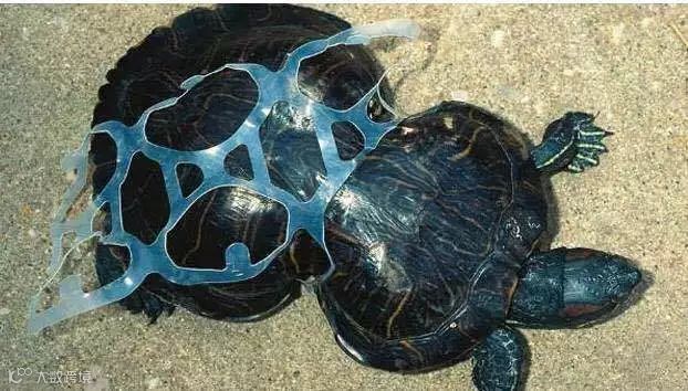 海龟被啤酒塑料提手缠身,导致龟壳长成畸形的花生状