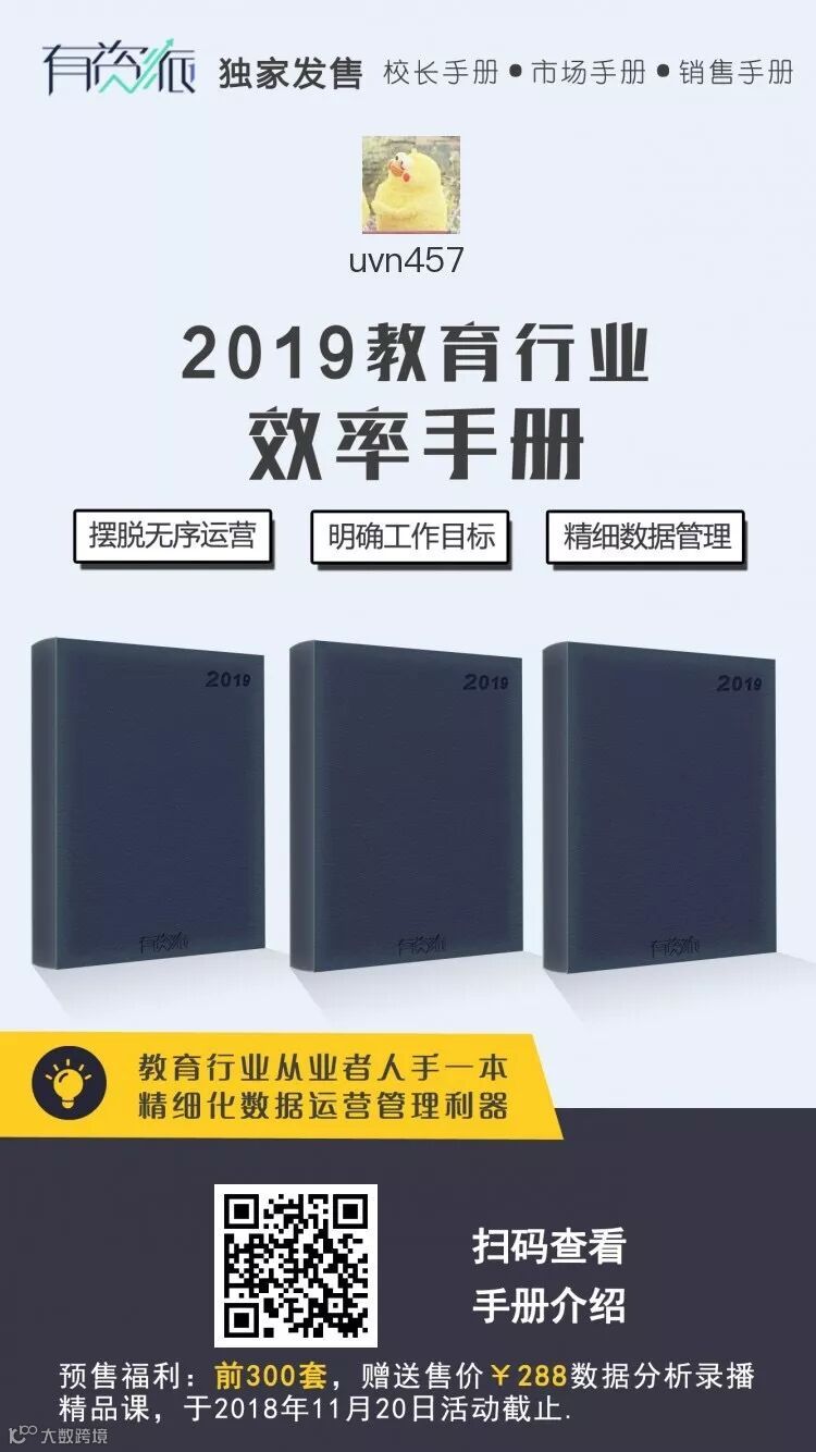 见惯了各种不易,也深知一个人一个团队的能力有限,无法深入到各处各家机构去解决问题。所以在2018年的尾声,2019年的到来之际,集合多位教育行业企业咨询师,合计三四十年的工作经历,分析每个人所接触到的机构的问题,寻找共性,集结成册。以干货分享、数据推演算法,年、季、月、周总结和工作计划表,营销节点梳理等内容为主体,按市场、销售、校长等岗位细分,设计教育行业专用实用性时间、目标管理工具手册,帮助从业者更好的进行数据化管理和精细化运营。