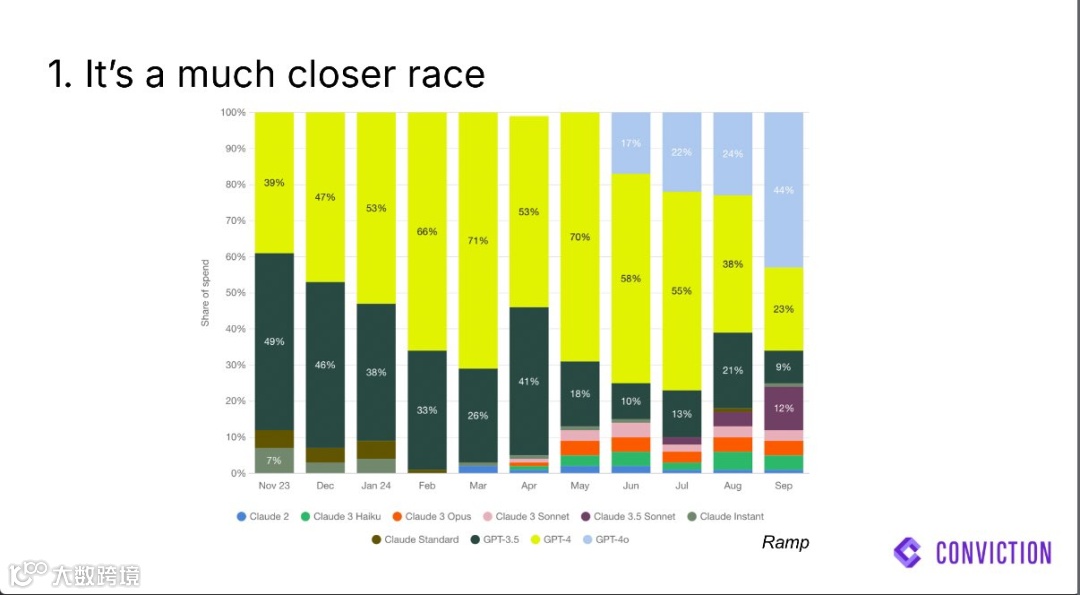 首先,基础模型领域的竞争比2023年更加激烈。LLM Arena的用户评估显示,OpenAI模型已经从领先100分以上变成了略微落后于Google Gemini。这表明大语言模型的切换非常容易,人们正在尝试不同的选择来找到最适合自己的模型。2023年11月,OpenAI占据了90%的市场份额,目前已降至60%左右。