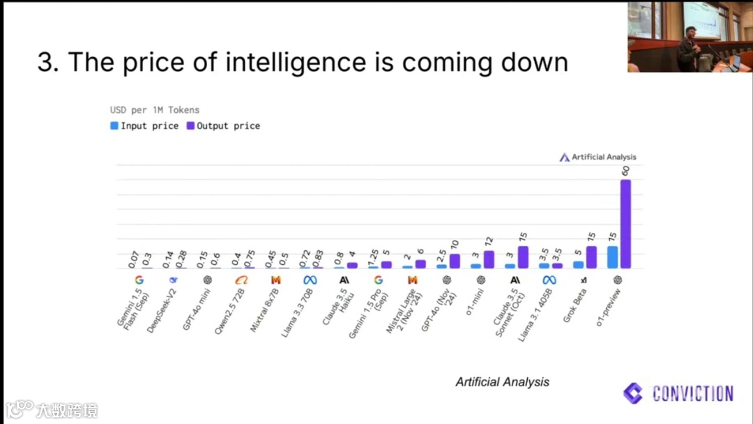 第三,AI成本大幅下降。OpenAI的API成本在过去一年半中下降了80-85%,其他模型的价格也在下降,这使得创建大量数据变得更加经济实惠。