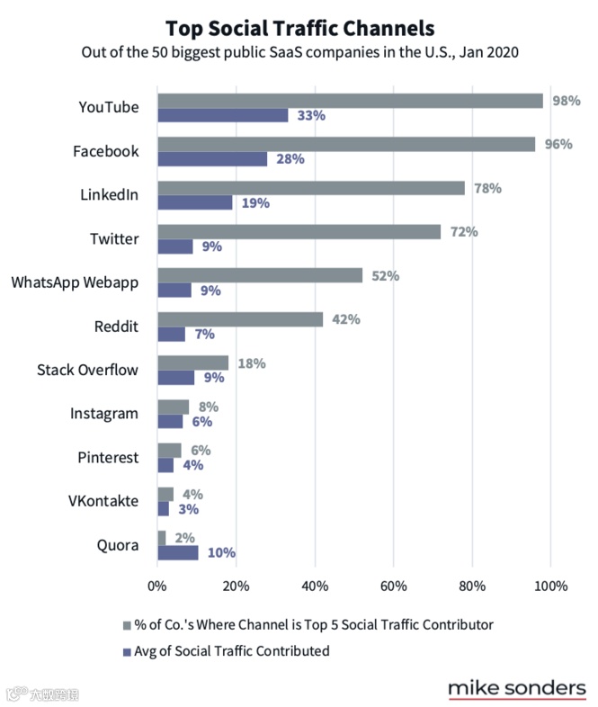 YouTube是98%最成功的SaaS公司社交流量的最大贡献者。