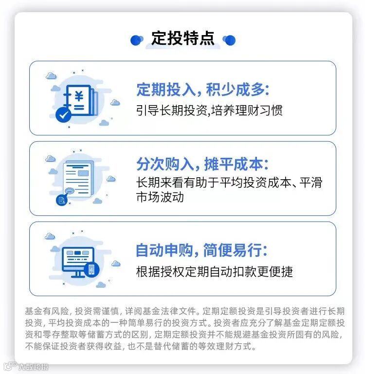 基金有风险,投资需谨慎。定期定额投资是引导投资长期投资、平均投资成本的一种简单易行的投资方式。但是定期定额投资并不能规避基金投资所固有的风险,不能保证投资人获得收益,也不是替代储蓄的有效理财方式。以上内容仅供参考,不作为任何投资建议。