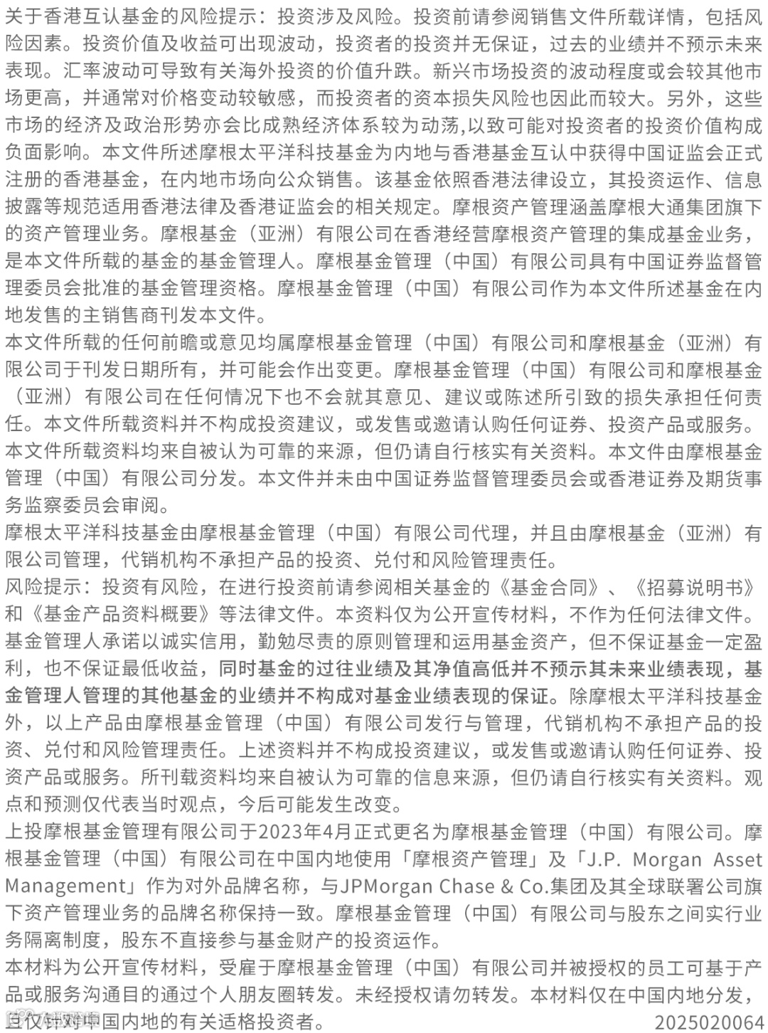 摩根资产管理深度融合国际投资视野与本地实战经验,深度挖掘中国科技崛起带来的投资机会,打造了独具特色的“摩根全球视野投科技”系列优选基金,为中国投资者提供了覆盖A股、港股及太平洋地区等市场的多元化投资解决方案。