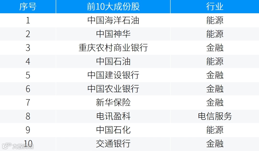 标普港股通低波红利指数,汇集港股通市场中50只波幅最小、收益率高的股票作为成份股。目前,指数的前10大成份股基本都来自内地金融、能源、电信等高股息行业中的国央企龙头: