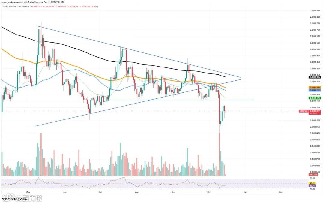 Shiba Inu再次濒临关键关口,其价格是否正式再加一个零,可能在未来三天内揭晓。SHIB 目前交易价约为 0.0000107 美元,正危险地接近 0.0000099 美元的重要心理关口。如果 SHIB 价格被突破,这将是自 2024 年初以来该代币首次在交易价上加一个零,这实际上证实了该 meme 币的长期下跌趋势。
