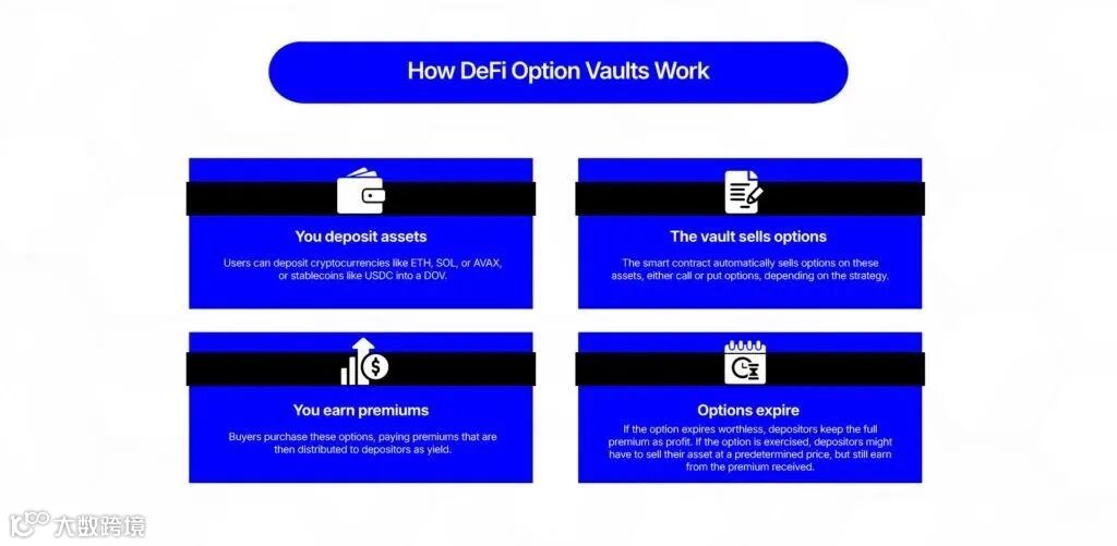 DOV 是基于智能合约的协议,可实现期权交易的自动化。您无需亲自主动管理交易,只需将加密货币存入金库即可。该金库随后会代表您出售期权,并从买家处收取期权费。这是一种被动获取加密货币价格波动收益的方式。