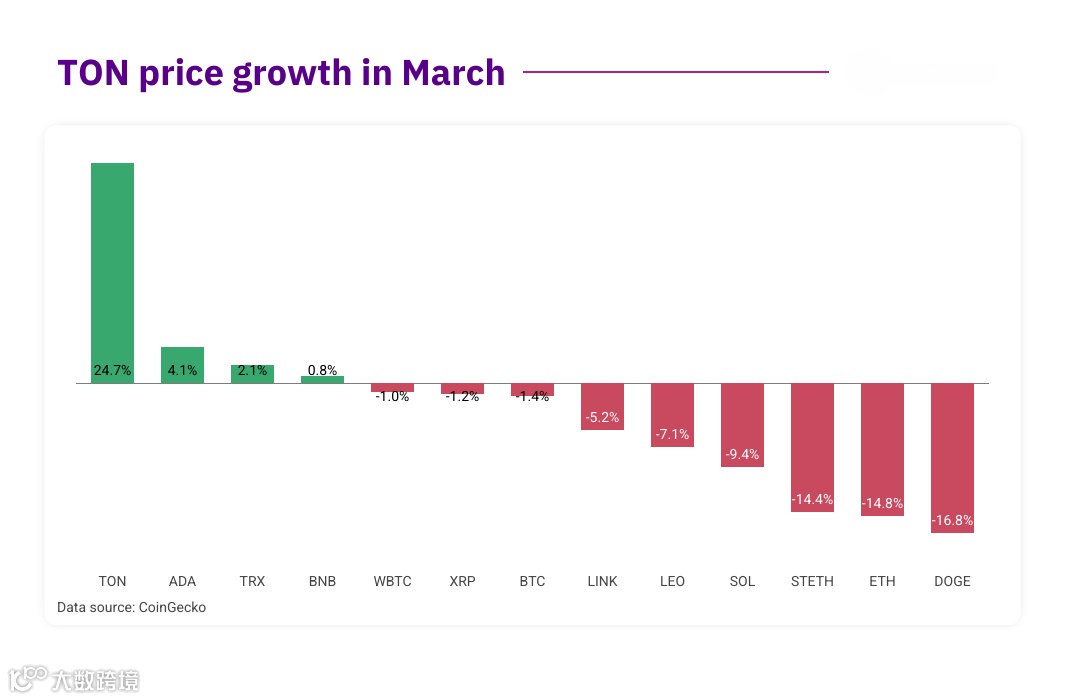 在市值排名前 15 位的加密货币中,TON 是 3 月份表现最强劲的货币,上涨了约 25%。紧随其后的是 Cardano 和 Tron (TRX),分别上涨了 4% 和 2%。其余货币均出现下跌。