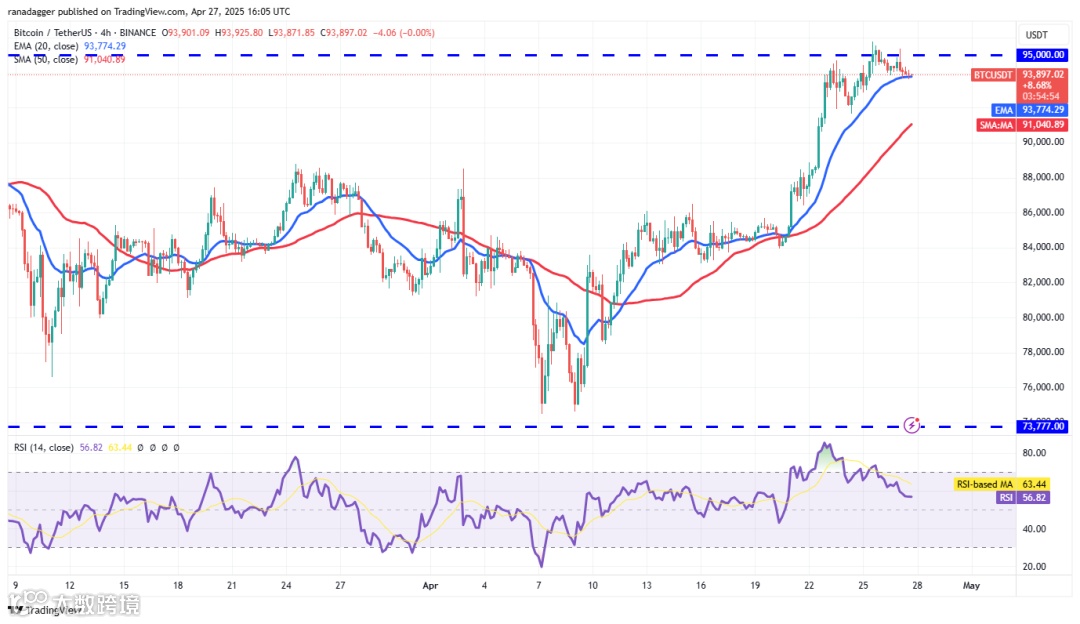 20天指数移动平均线(88,619美元)呈上行趋势,相对强弱指数(RSI)接近超买区域,表明多头占据主导地位。若收盘价突破95,000美元,BTC/USDT货币对可能升至100,000美元,并最终达到107,000美元。预计空头将积极捍卫107,000美元至109,588美元之间的区域。
