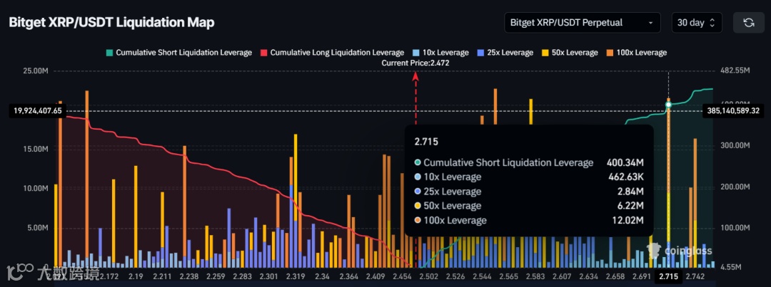如果 XRP 价格上涨 10%,则可能面临 4 亿美元的清算,这将影响押注其复苏的空头卖家。 -