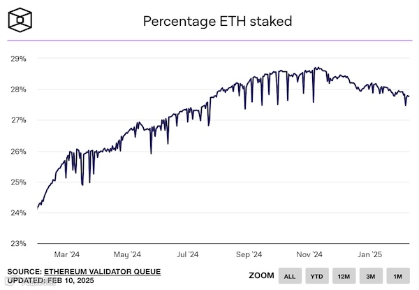 The Block 的数据显示,以太坊质押合约中ETH的质押比例已下降至 27%,回到了 2024 年 7 月的水平。这是自 2024 年底 ETH 质押比例达到 29% 的峰值以来的首次明显下降。