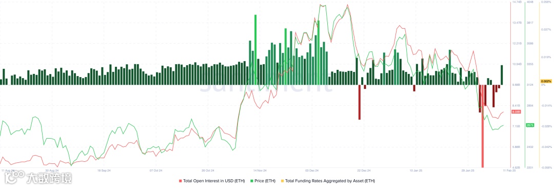 衍生品交易员的指标显示,市场情绪正在转向“看涨”。图表显示,在出现几次负增长后,衍生品交易所的融资利率合计转为正值。根据 Santiment 的数据,以太币所有未平仓衍生品合约的总未平仓合约价值攀升至 80.3 亿美元。