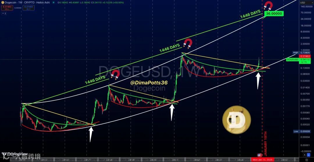 如前所述,每个周期结束时狗狗币的表现都超越了前一个周期的高点。因此,Potts预测2025年也将呈现出类似的趋势。他提到:“预计在2025年1月19日左右可能会出现新的高点。我坚信,由于之前每个周期的涨幅百分比都在递增,这个周期将为狗狗币带来前所未有的大幅增长。”一张图表显示,狗狗币的潜在目标价高达36美元,这将是其当前价格的80多倍。从市值角度来看,这将意味着狗狗币的市值将达到约5.3万亿美元。作为对比,目前整个加密货币市场的市值约为3.5万亿美元。因此,可以合理推断,到2025年1月19日,狗狗币的价格不太可能轻易突破30美元大关。